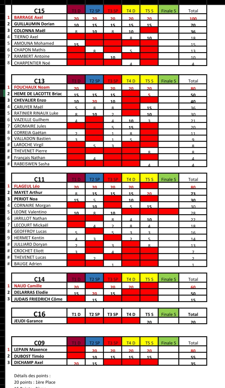 Classement général provisoire : 1er Axel BARGES 80 pts , 2ème Dorian 55 pts , 3ème Maël 36 pts , 7ème Axel TIERNO 8pts .